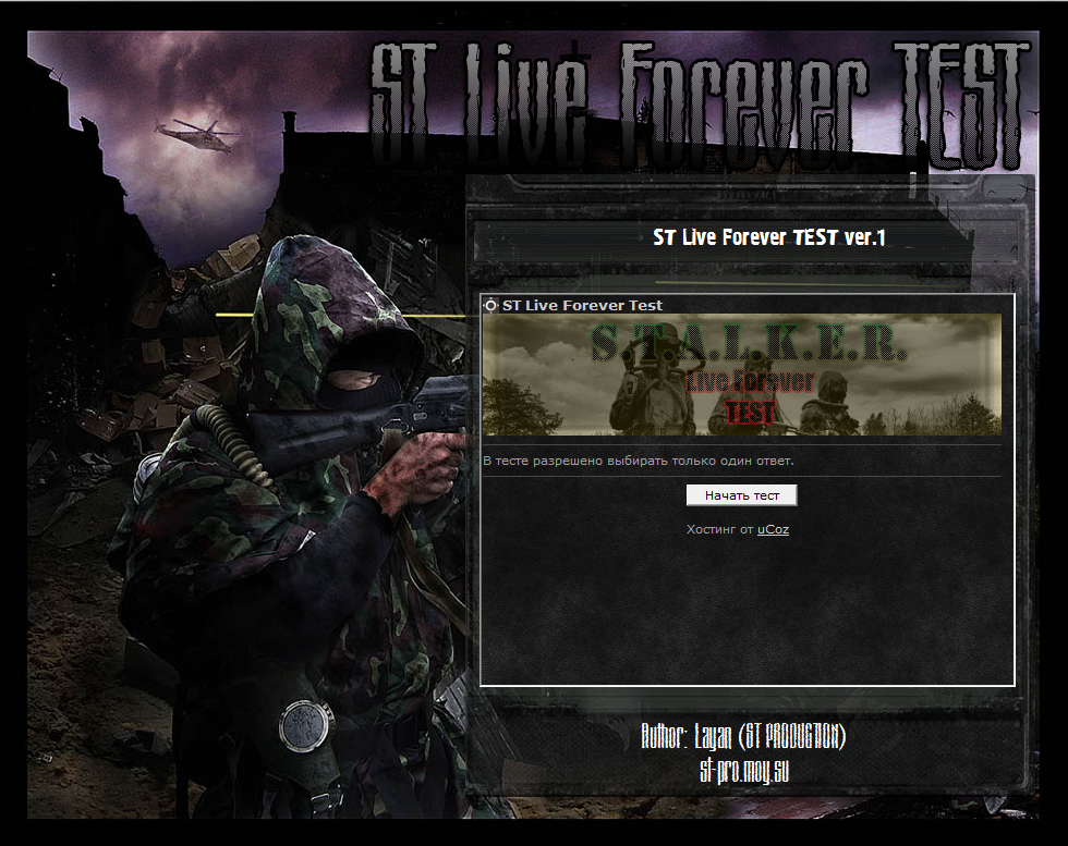 Представляю вам тест по сталкеру от нашего сайта. В нём вы найдете 15 вопросов на которые вам предстоит ответить. При всех правильных ответах вы получите группу V.I.P. и ранг 8 (Работает только при регистрации).